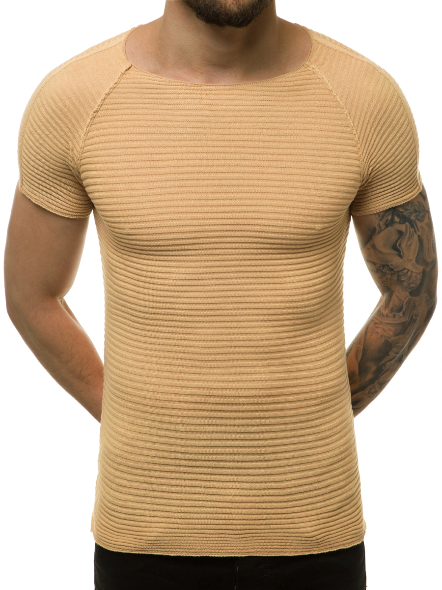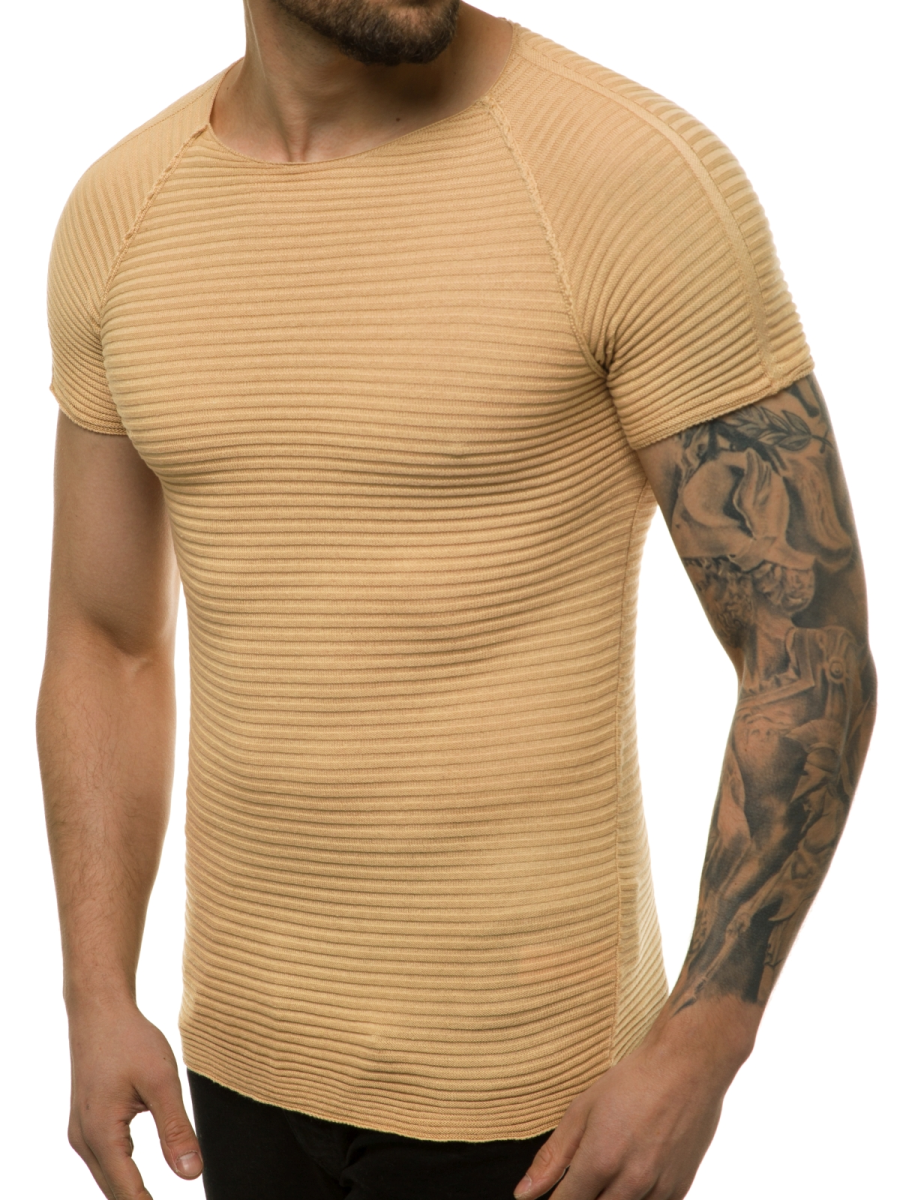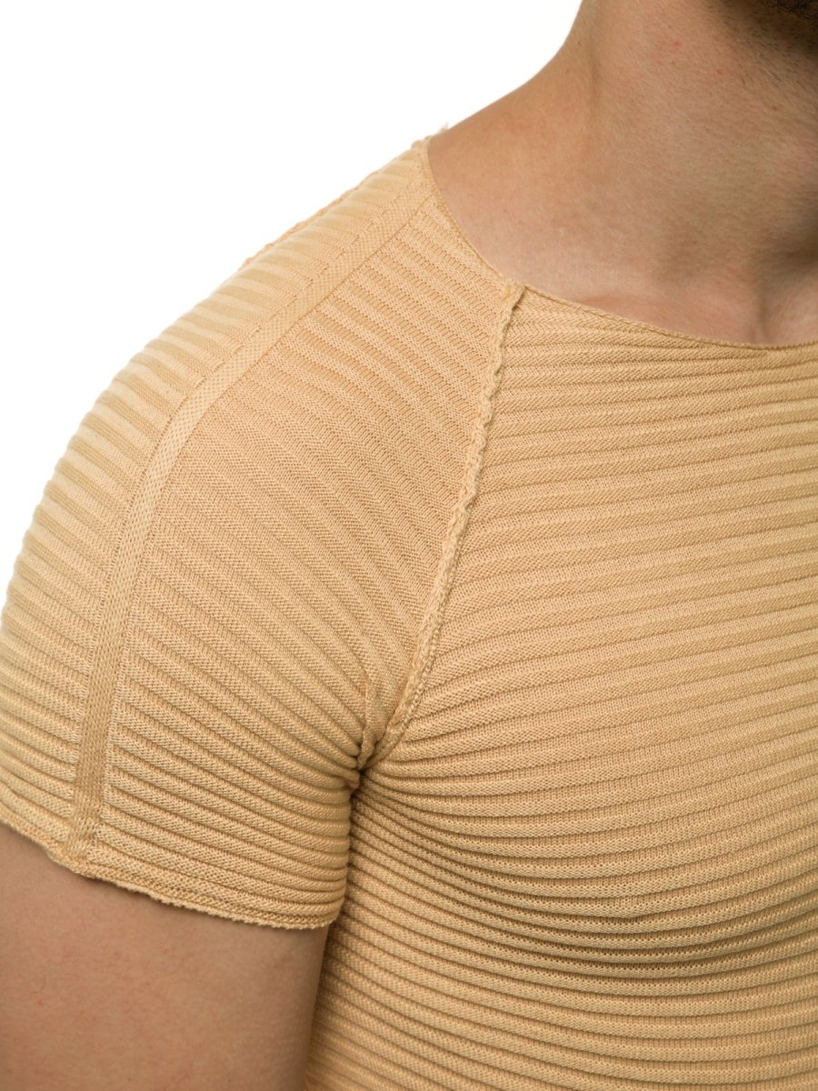 Tričko má klasický okrúhly výstrih do tvaru U a krátke rukávy. Pruhovaný vzor, ktorý ho pokrýva, dodáva originálny charakter. Tričko bolo vyrobené z kombinácie bavlny, akrylu a viskózy. Vďaka tomu je pohodlné na nosenie, príjemné na dotyk, pekne sa prispôsobí postave, nekrčí sa a nerozťahuje sa.