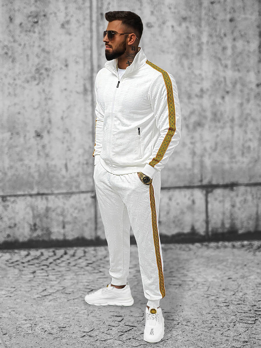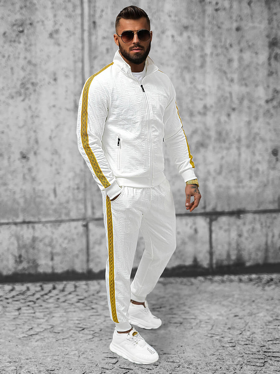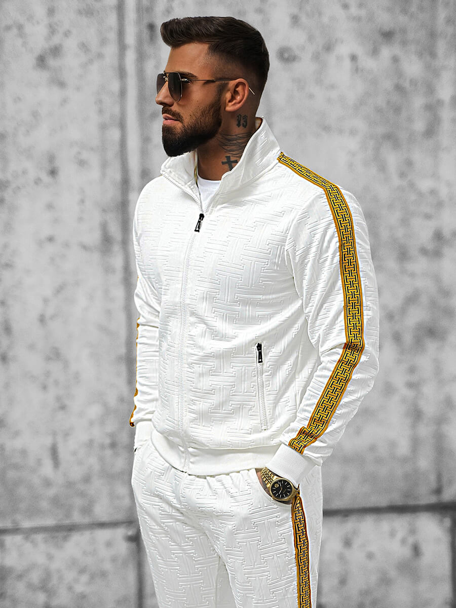 Súprava z najnovšej kolekcie. Skladá sa z dvoch prvkov. Sú to mikina na zips s lemami a kontrastnými lemami a nohavice s lemami a kontrastnými lemami. Vyrobená z kvalitného polyesteru s prímesou elastanu, vďaka čomu krásne sedí na postave, nekrčí sa, rýchlo schne a je odolná proti zafarbeniu.