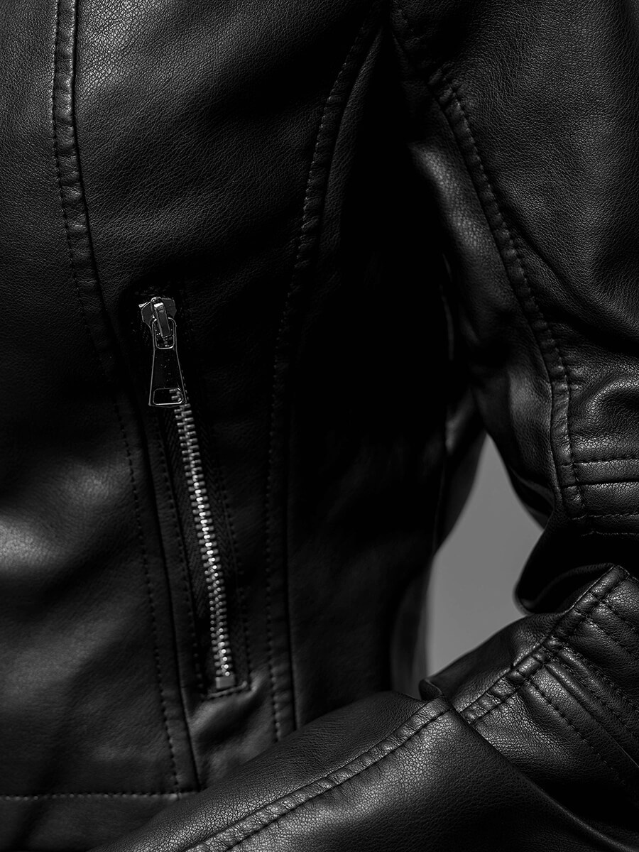 Bunda pochádza z najnovšej kolekcie. Zapína sa na zips. Ozdobné prešívanie a zipsy na rukávoch jej dodávajú originálny vzhľad. Na bokoch sú vrecká na zips, kam schováte rôzne drobnosti, ako je mobil, peňaženka alebo kľúče. Je vyrobená z polyuretánu a jej podšívka je z polyesteru. Vďaka tomu krásne sedí na postave, je odolná a nekrčí sa.