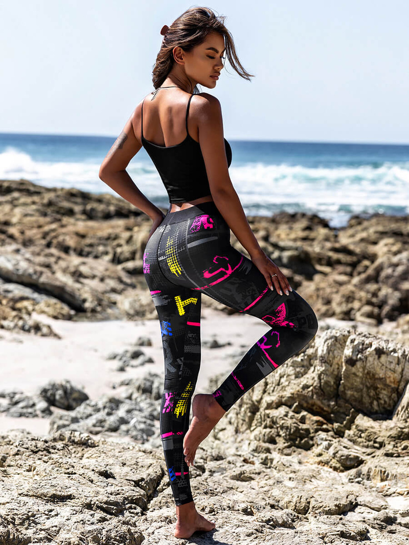 Legíny zdobí farebný vzor, vďaka čomu vyzerajú veľmi efektne. Majú vysoký pás, ktorý účinne chráni nedostatky postavy, ako napríklad vyčnievajúce bruško alebo boky. Pás so sťahovacou šnúrkou drží legíny na mieste a bráni ich krúteniu. Sú vyrobené z polyesteru s prímesou elastanu, vďaka čomu sú pohodlné, ľahké a pekne priliehajú na telo.