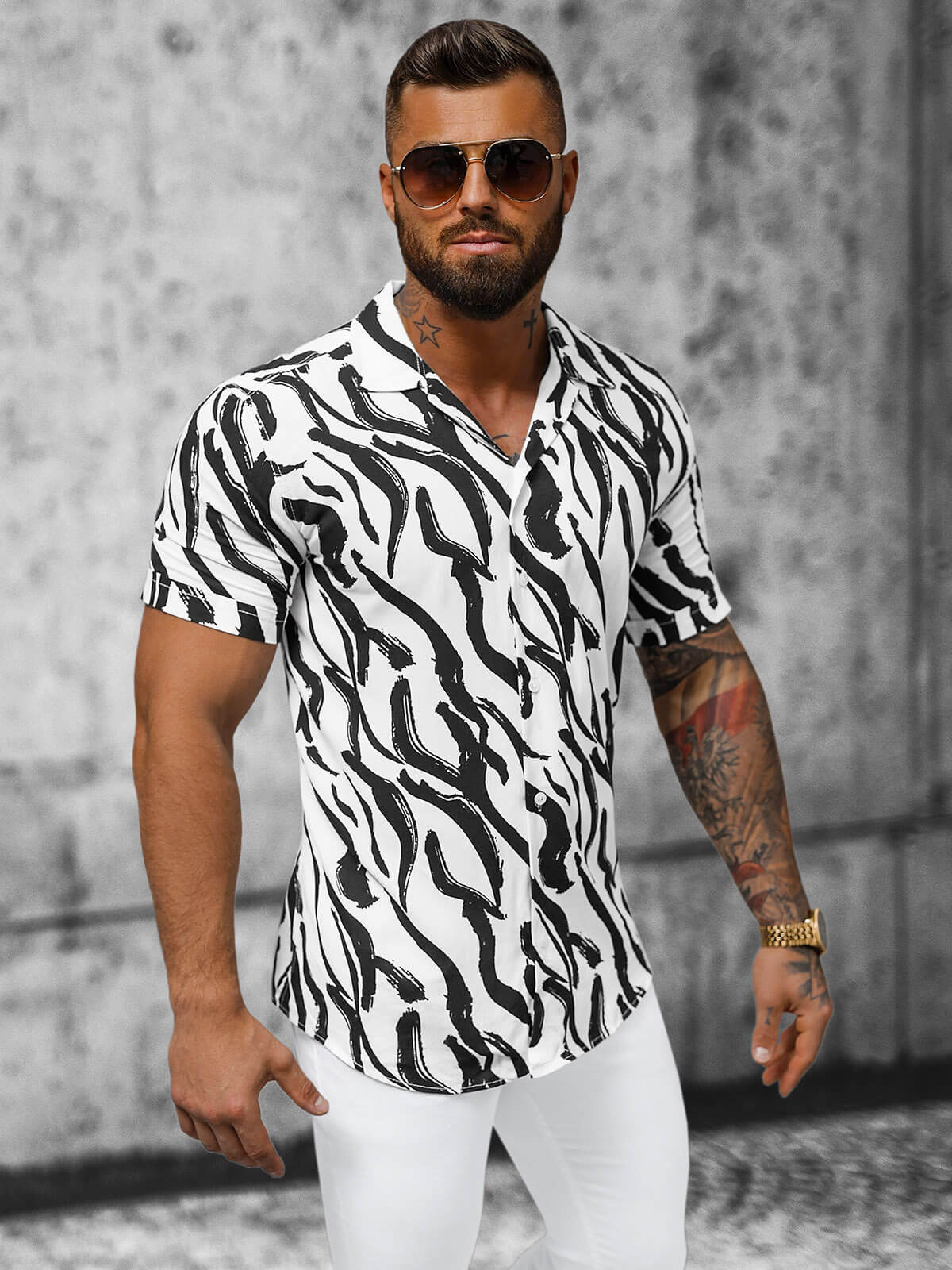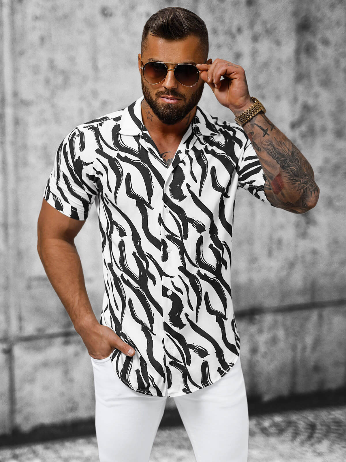 Unikátnym prvkom tejto košele je kubánsky golier, ktorý jej dodáva jedinečný charakter a štýl. Dizajn vo vlnových pruhoch, kontrastujúci bielu s čiernou, predstavuje svieži prístup k klasickému dizajnu a určite pritiahne mnoho pohľadov.