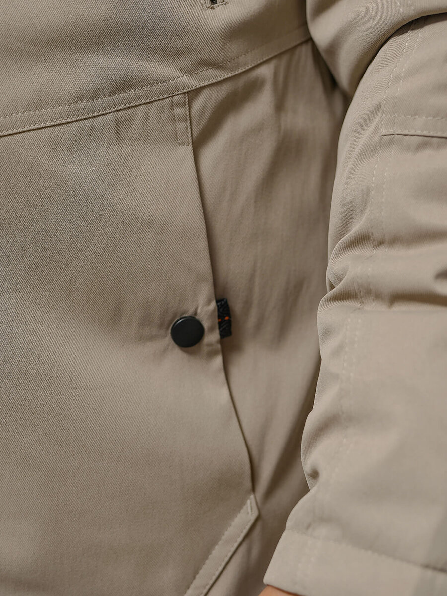 Praktické vrecká na bokoch a vpredu so zapínaním na cvočky umožňujú uloženie drobných predmetov. Okrem toho má bunda aj vnútorné vrecká, ideálne na uloženie telefónu alebo peňaženky.