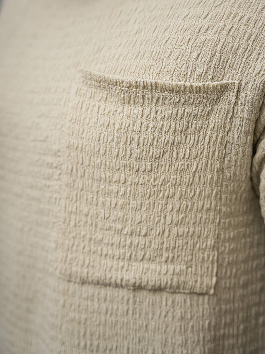 Podčiarknite svoju mužnú eleganciu s novou kolekciou pánskych základných tričiek od značky OZONEE. Toto béžové tričko vyrobené z úpletu najvyššej kvality poskytuje nielen výnimočný komfort pri nosení, ale aj módny vzhľad. Vyniká jedinečným vyvýšeným vzorom, ktorý mu dodáva jedinečný nádych. Tričko je navyše vybavené praktickým vreckom na prednej strane, ktoré mu dodáva na funkčnosti.