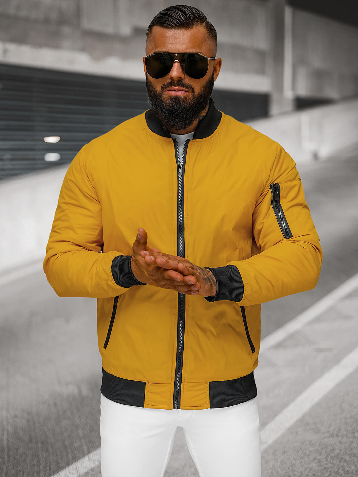 Bunda pochádza z novej kolekcie. Má bomber strih. Čo ju odlišuje, je dĺžka po pás a lemy v spodnej časti a na rukávoch. Bunda sa zapína na zips. Na bokoch má vrecká a na rukáve vrecko na zips. Bez problémov sa do nich zmestia potrebné drobnosti, ako sú kľúče, peňaženka či telefón. Bomber je vyrobený z polyesteru, vďaka čomu pekne prilieha na postavu, nekrčí sa, nerozťahuje sa a rýchlo schne.