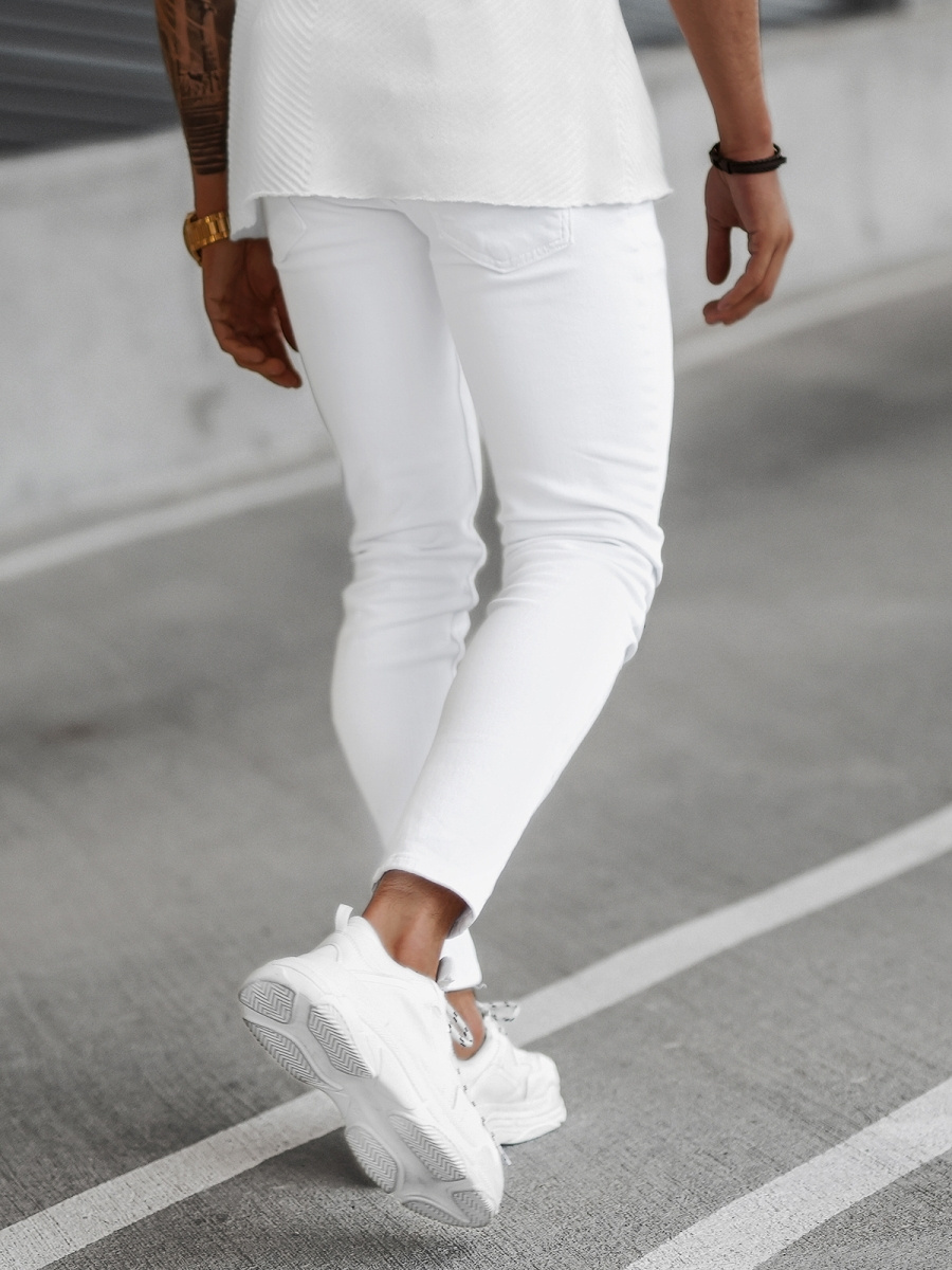 Biele džínsy sú nevyhnutnosťou v jarnom/letnom šatníku každého muža. S ich pomocou môžete vytvoriť veľa módnych štýlov pre teplé dni. Nohavice sa budú skvele hodiť k pánskemu oblečeniu dostupnému v sortimente nášho internetového obchodu, ako sú tričká, tielka alebo dlhé rukávy. Biele džínsy s úzkymi nohavicami sú vhodné na rôzne príležitosti - stretnutie s priateľmi, párty, koncert alebo rande.