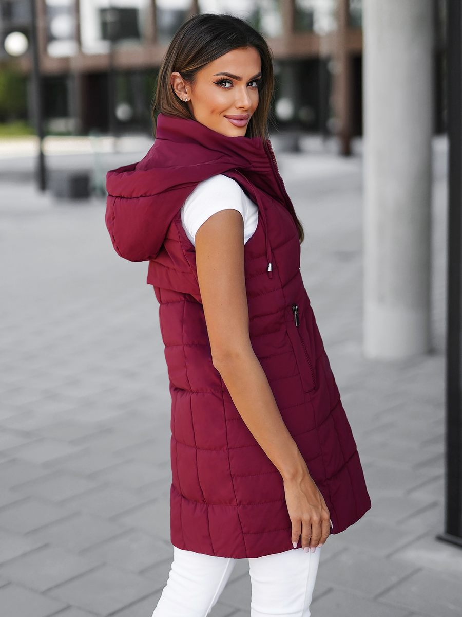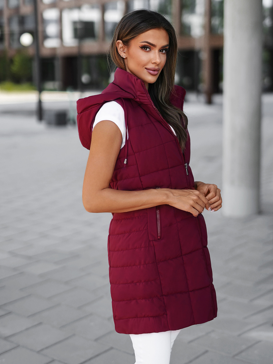 Dámska dlhá prešívaná vesta s kapucňou bordová OZONEE JS/16M9096/06