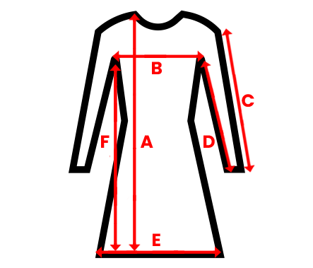 | Veľkosť | Długość całkowita A | Szerokość pod pachami B | Długość rękawa od ramienia C | Długość rękawa wewnętrzna D | Szerokość na dole E | Długość od pachy F |