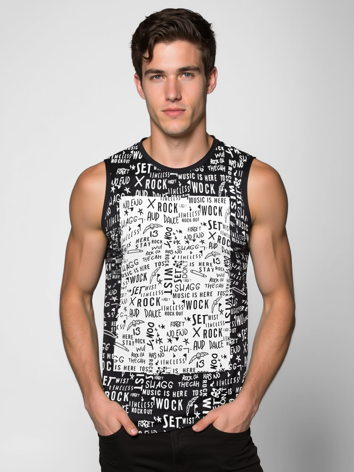 Tričko má tanktopový strih, t. j. bez rukávov. Pochádza z najnovšej kolekcie nášho online obchodu. Celú prednú stranu trička zdobí originálna potlač zobrazujúca veľké množstvo drobných nápisov. Tielko je vyrobené z kombinácie bavlny a polyesteru. Vďaka tomuto zloženiu je veľmi pohodlné na nosenie, príjemné na dotyk, pekne sedí na tele, nemačká sa a možno ho prať v práčke.