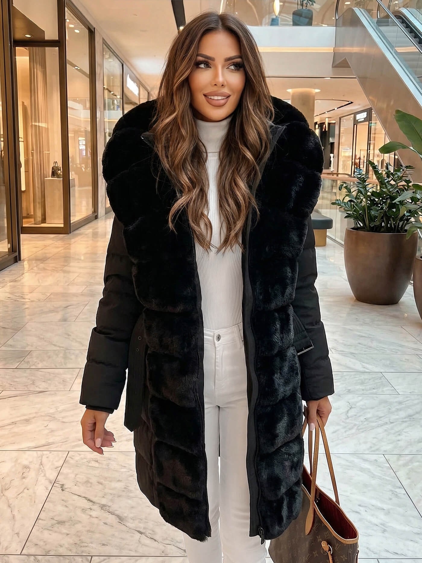 Dizajn zahŕňa priestrannú kapucňu, odnímateľnú ozdobnú kožušinu, moderné stehovanie a bočné vrecká na zips. Rukávy sú ukončené manžetou, čo zaisťuje dokonalé priliehanie a ochranu pred chladom.